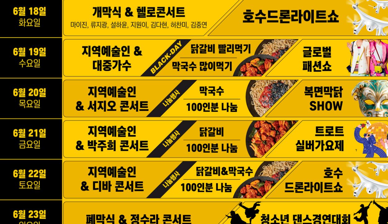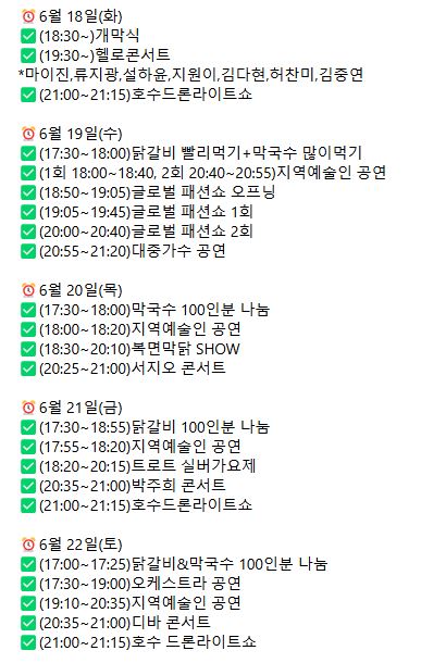 이번주 일요일까지 하는 축제 정보, 시간표를 확인하셔서 놓치지 마시고, 즐거운 축제 즐기시길 바랍니다.