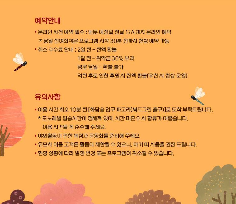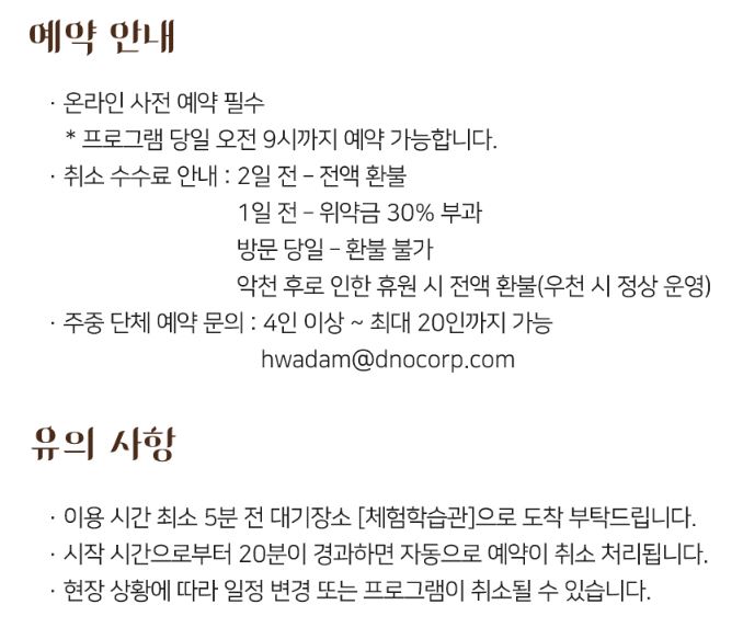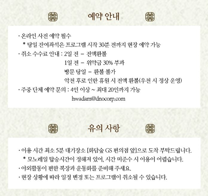 화담숲 방문 1일전까지 취소할 경우 비용 전액 환불이 되며, 당일 취소 수수료는 30% 입니다.